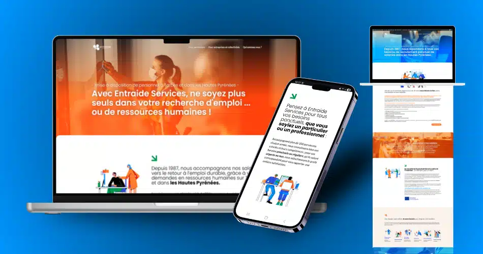 Entraide Services est une association intermédiaire spécialisée dans la mise à disposition de salariés par le biais de l'insertion, située à Tarbes et officiant sur les Hautes Pyrénées. Je travaille avec eux au renouvellement et à la modernisation de leur communication depuis le début de l’année, et nous voilà arrivés à la création de site web nouvellement dédié à l’association, qui avant partageait sa plateforme avec deux autres entreprises de Tarbes, ne permettant pas de voir clair dans les informations mises à disposition !